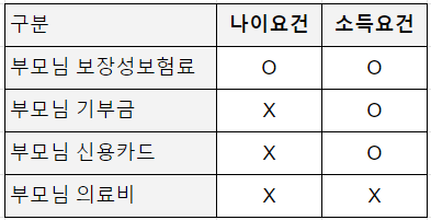 근로자의 부모님이 기본공제대상자 요건을 충족하면 부모님과 관련된 다른 공제도 적용받을 수 있습니다. 기본공제대상자 요건 일부만 충족해도 공제받을 수 있는 항목도 있어 아래에 정리해두었습니다.