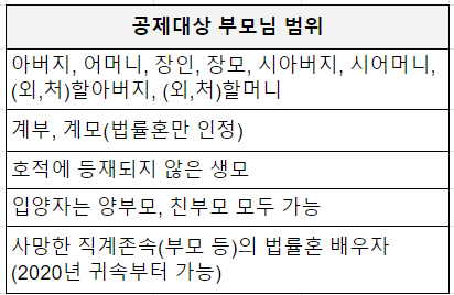 또한, 공제대상 부모님의 범위를 정리하면 아래와 같습니다.